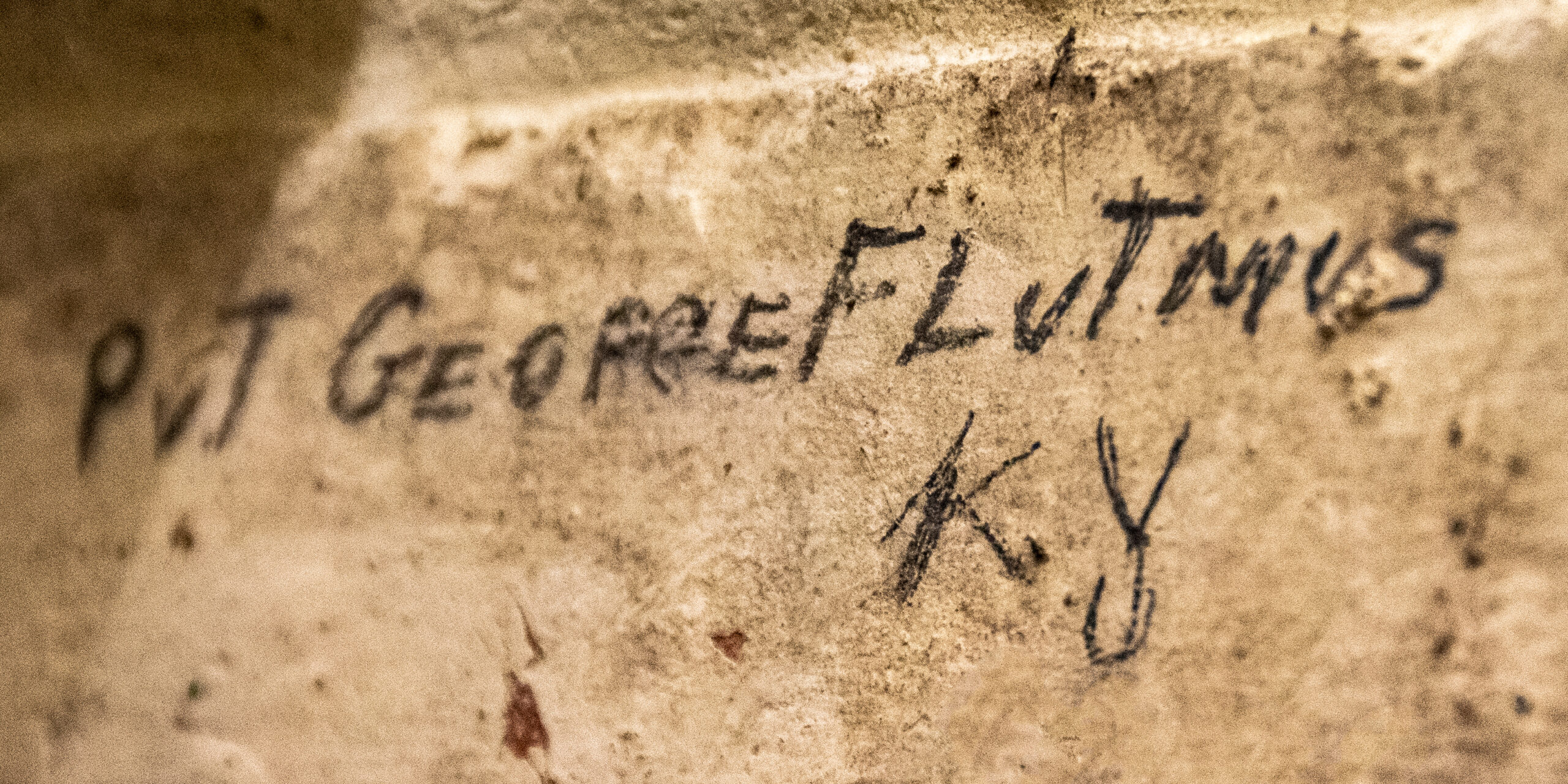 - Vince, who has run this for 30 years, found this graffiti on the wall. He traced the name back to Kentucky – George Flutmus was born in 1921 and was an 18 year old printer when he was drafted. He served with his brother and died aged 85.